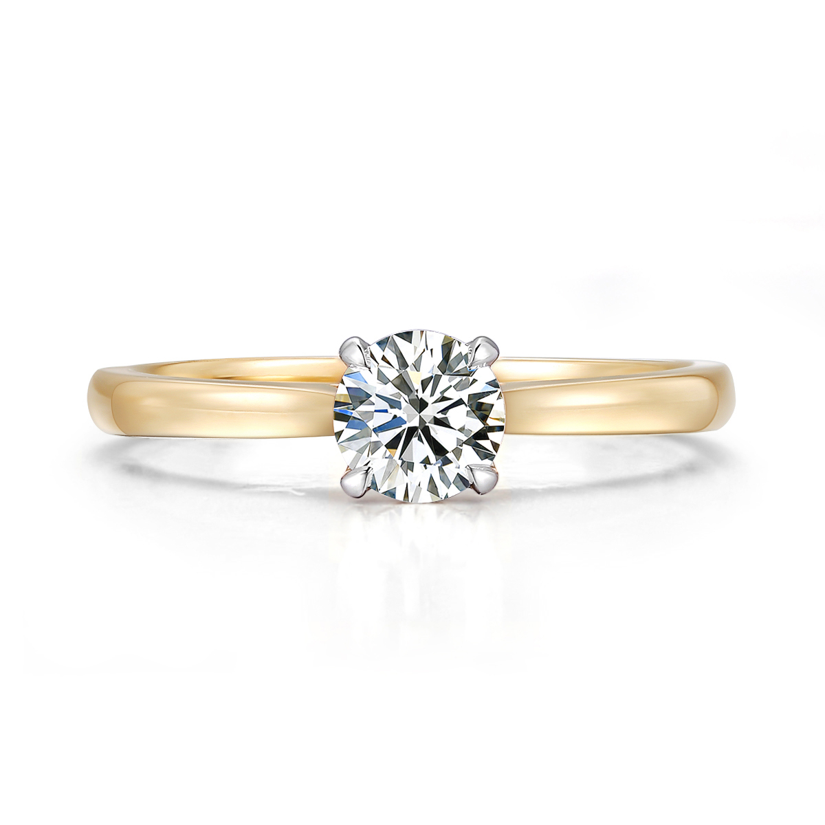 Czysta forma i współczesna elegancja. Obrączka z ciepłego żółtego złota tworzy smukły, jednolity okrąg, a delikatnie wznoszące się ramiona płynnie prowadzą wzrok ku półkaratowemu diamentowi. Czteroramienna korona z białego złota unosi brylant tuż nad linią palca, pozwalając światłu przenikać przez wszystkie 57 faset i wydobywać hipnotyzujący „ogień”.