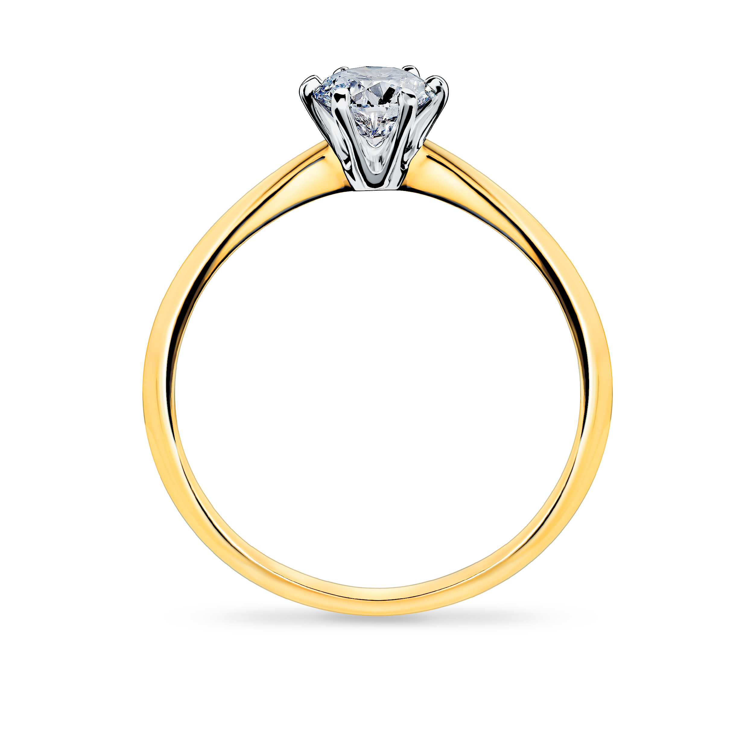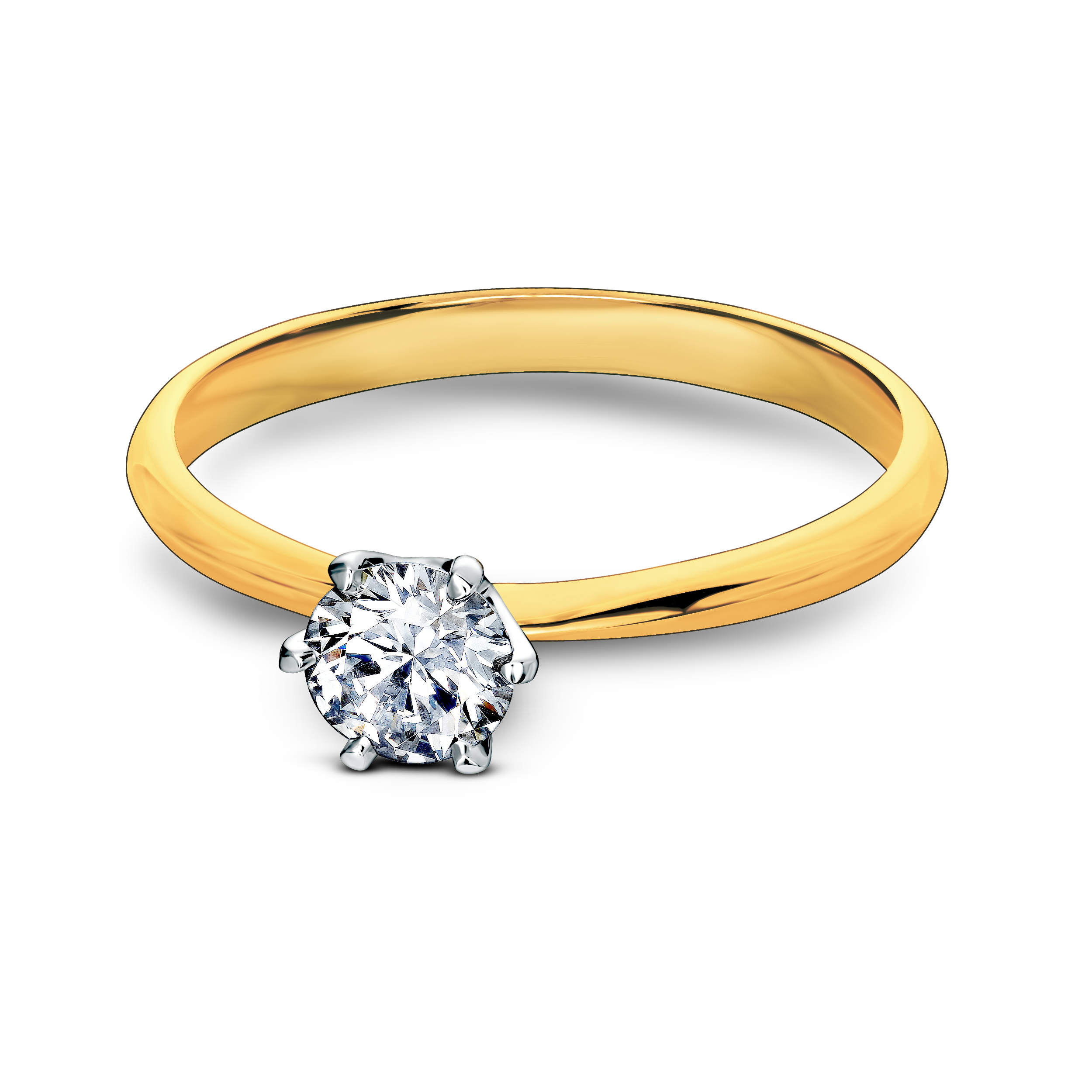 Smukła obrączka z ciepłego żółtego złota 14 k zwęża się ku górze, by subtelnie skierować uwagę na 0,5-karatowy diament. Chłodna korona z białego złota obejmuje kamień w sześciu łapkach, unosząc go ponad taflę metalu niczym kroplę czystego światła. Bezbarwna barwa E i czystość VS1 sprawiają, że każda faseta brylantu wybucha kalejdoskopem iskier nawet w łagodnym świetle świecy.